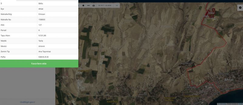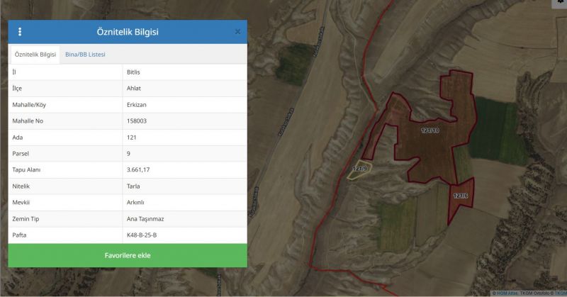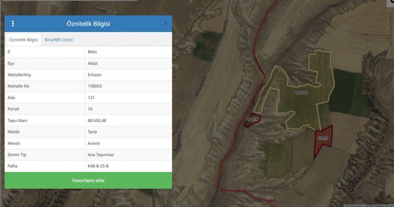 AHLAT ERKİZAN MAHALLESİ ARAZİSİ İLEKULAKSIZ MAHALLESİ ARAZİSİNİN KESİŞTİĞİ ARKINLLI MEVKİİNDE SATILIK TARLATARIM ARAZİSİ OLARAK KULLANILAN TARLAMIZ3 AYRI PARSELDEN OLUŞMAKTADIR.121 ADA - 6 PARSEL : 9.531,86 m2'dir121 ADA - 9 PARSEL : 3.661,17 m2'dir121 ADA - 10 PARSEL : 88.650,48 m2'dirTARLAMIZ TOPLAMDA: 101.843,51 m2'dir