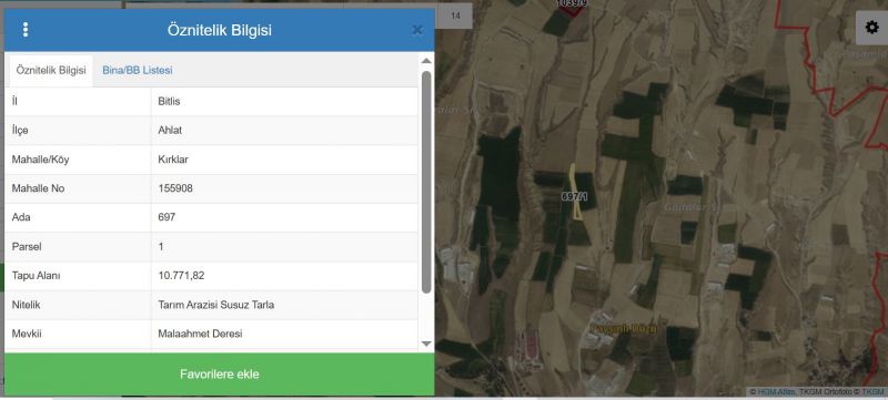 YATIRIMCISINA KAÇIRILMAYACAK FIRSAT!Bitlis İli Ahlat İlçesi Kırklar Mahallesi Mala Ahmet Deresi Mevkiinde Bulunan, Toplam 10.771 m² Büyüklüğündeki Tarım Arazisi Satışa Sunulmuştur.Bölgenin Gelişime Açık Konumu Ve Doğal Yapısı İle Uzun Vadeli Yatırımcılar İçin Oldukça Cazip Bir Seçenektir.📌 İlan ÖzellikleriKonum: Ahlat Kırklar Mahallesi – Derin Dere MevkiiAda / Parsel: 697 Ada – 1 ParselTapu Durumu: Tek TapuNitelik: Tarla (Tarım Arazisi)Net Alan: 10.771 m²M² Fiyatı: 500 TLSatış Şekli: Emlak Ofisi AracılığıylaTakas: Yok