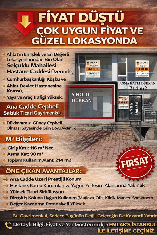 🔹 🔹 🔹 Fiyat Düştü 🔹 AHLAT HASTANE CADDESİNDE CAZİP FİYATA SATILIK 116 + 98 m2 ASMA KATLI DÜKKAN